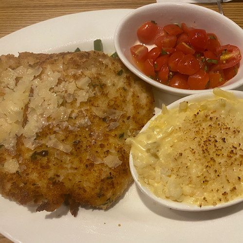 Another dish I ordered was Dana’s parmesan-crusted chicken. It comes with a Tomato Basil Relish, Lemon Butter, Betty’s Potatoes, Garlic Green Beans. I ordered this dish with the tomato basil relish on the side instead of on top of the chicken. Alongside the Gonnoci this is another favorite dish of mine that I get.