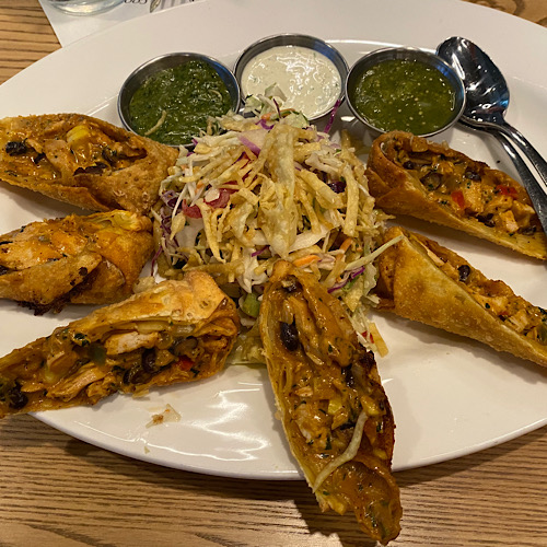 We sat down and the waiter asked us if we would like to order an appetizer. The waiter suggested we try the over the border egg rolls which was a favorite by many and when I tried them I knew why. It is a House-Made with Southwest Chicken, Corn, Black Beans, Cilantro, and Cheese; Tomatillo Salsa, Cilantro Ranch, and Cashew Dipping Sauces. They give you three sauces they give you are good buy my favorite one of the three is the Cilantro Ranch. This dish in not spicy at all.