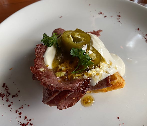 After that came the fried bologna which came with a  potato waffle, cream cheese, and a jalapeño. This was so good.