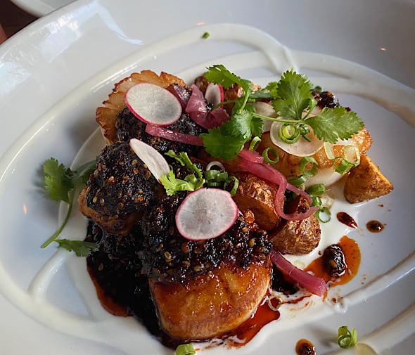 Then came the sea scallops which had fingerling potato with a n ancho chile and peanut sauce, topped with creme fraiche.